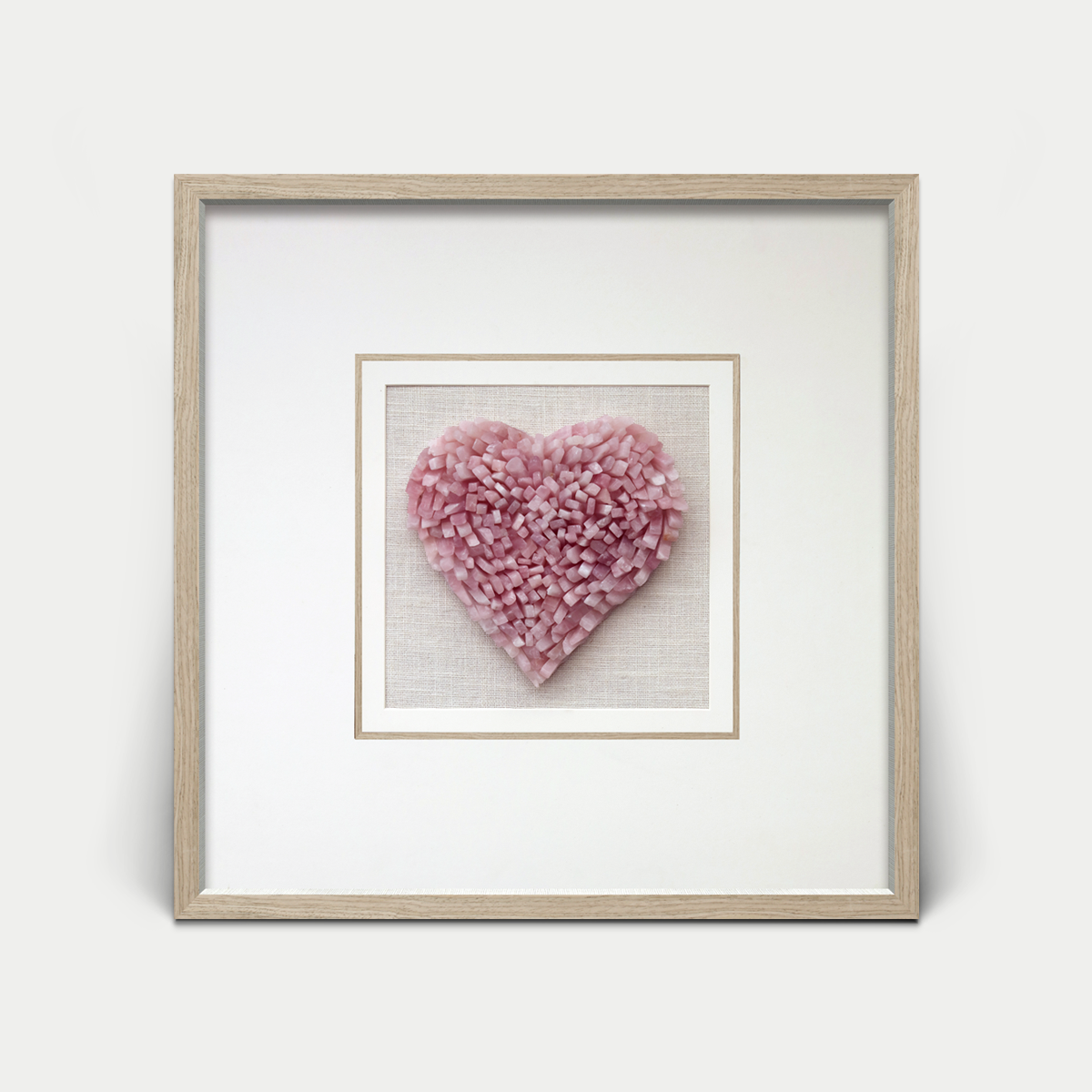 Jedes Herzstück wird zu 100 % von Hand gefertigt – ein einzigartiges Kunstwerk aus natürlichem Rosenquarz auf cremeweißem Leinen, eingefasst in einen eleganten hellgrauen Holzrahmen. Die verstärkte Glasscheibe schützt die zarte Oberfläche, während die natürlichen Kristallstrukturen das Licht auf poetische Weise brechen und jeden Raum in eine harmonische Atmosphäre tauchen.