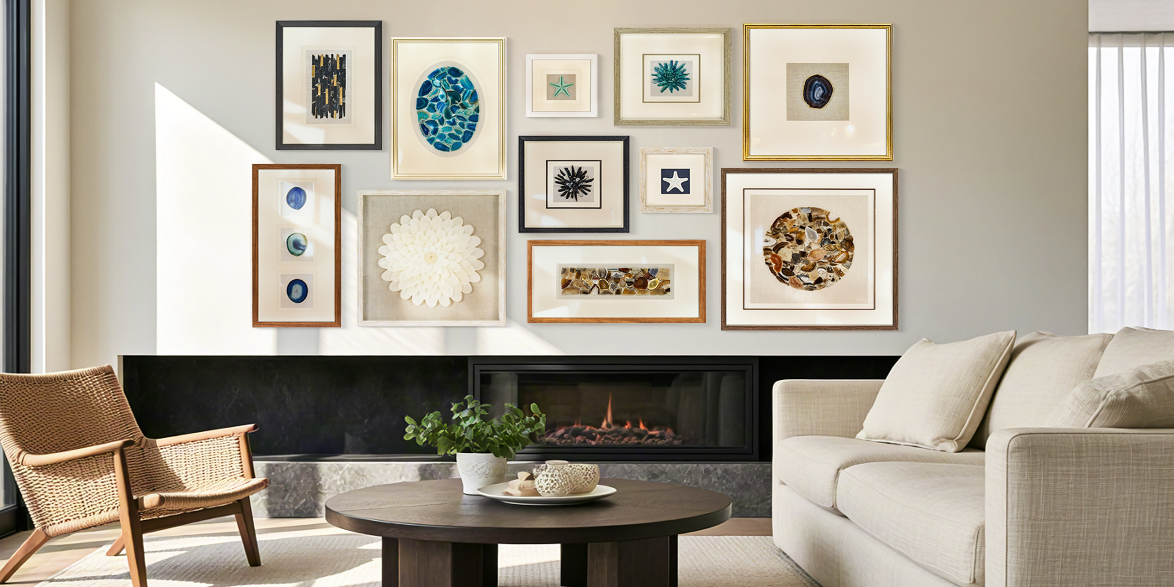 Natürliche Achatstücke-Wanddeko mit dunkelbraunem Holzrahmen
